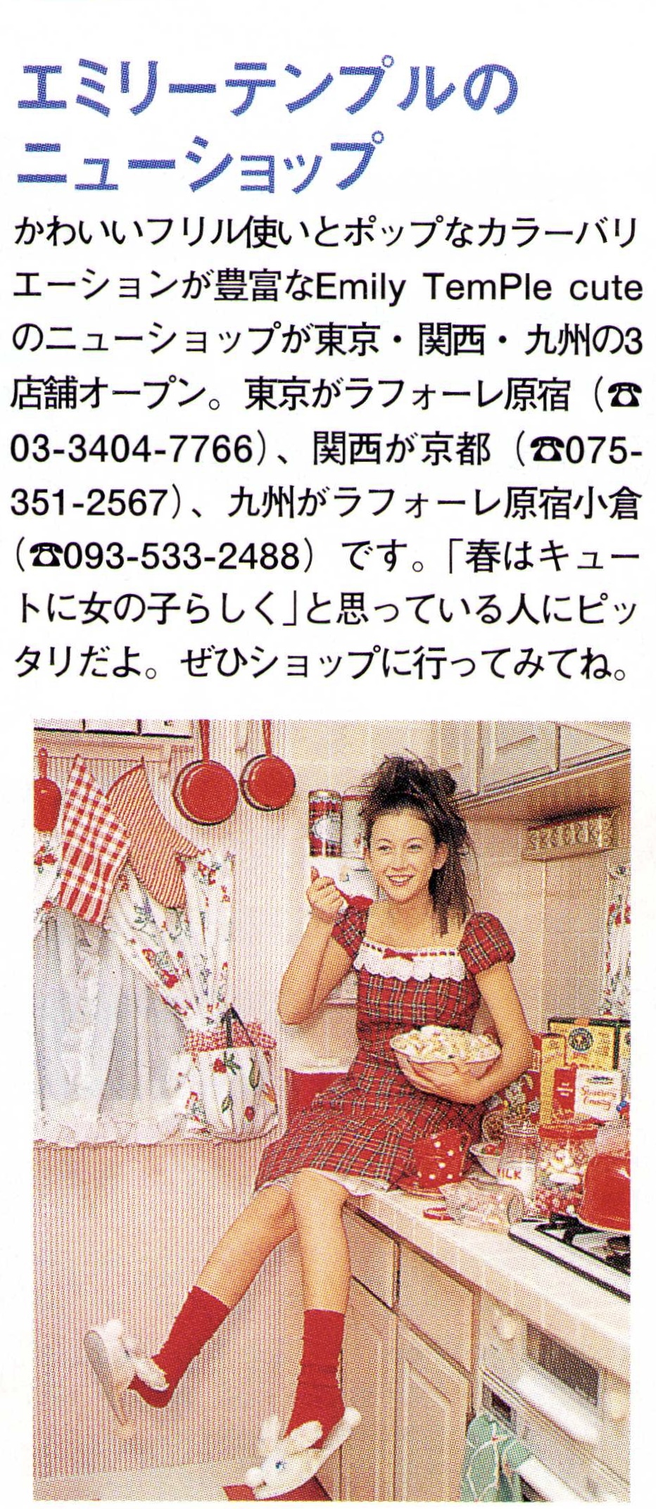 The model is Alice. Translated description: "Emily Temple's New Shop. Emily Temple cute, which offers cute frills and a wide variety of pop colors, has opened three new stores in Tokyo, Kansai, and Kyushu. The Tokyo store is at Laforet Harajuku (☎ 03-3404-7766), the Kansai store is at Kyoto (☎ 075-351-2567), and the Kyushu store is at Laforet Harajuku Kokura (☎ 093-533-2488). It's perfect for those who want to look "cute and girly in spring." Be sure to visit the store.".