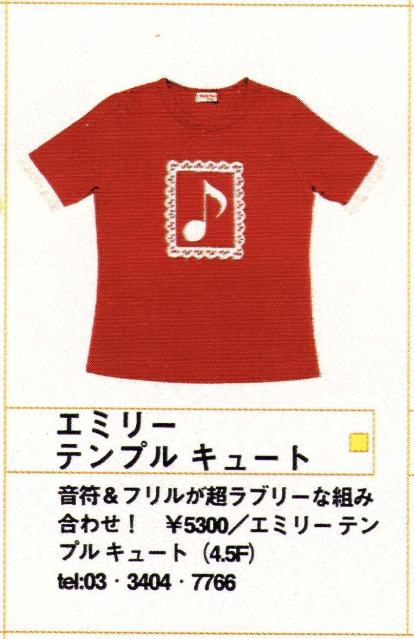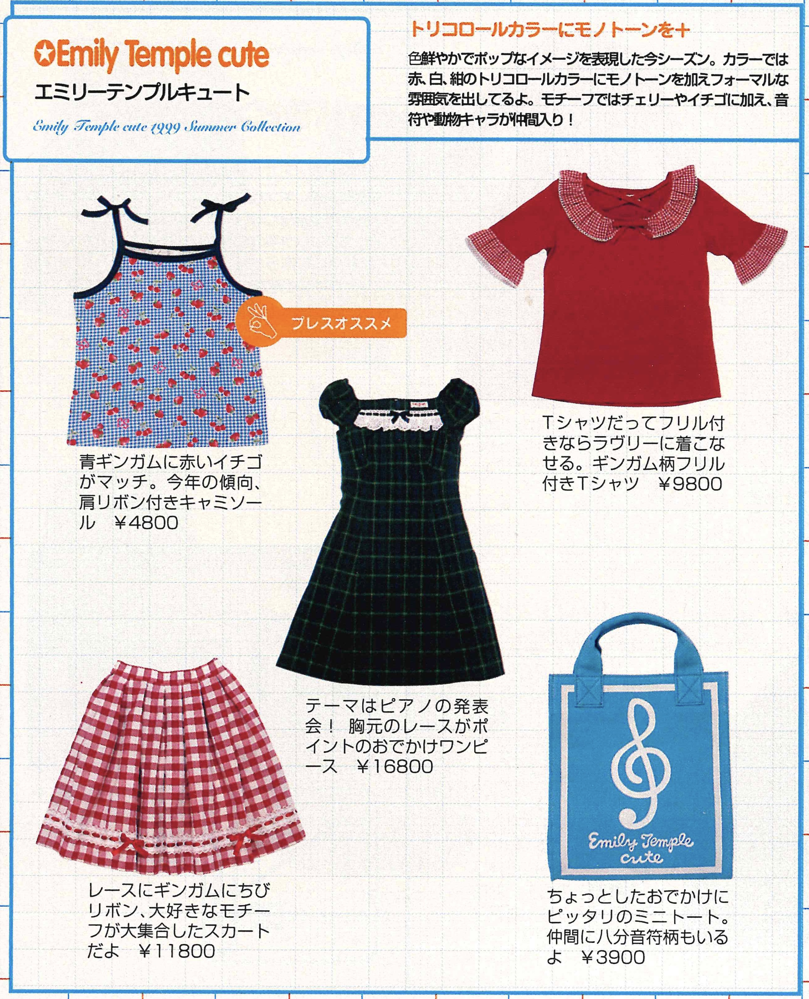 Emily Temple Cute 1999 Summer Collection. Translated description: "Tricolor + Monotone. This season expresses a colorful and pop image. The colors are red, white, and red tricolor with monotone added to create a formal atmosphere. In addition to cherries and strawberries, the motifs include musical notes and animal characters!".