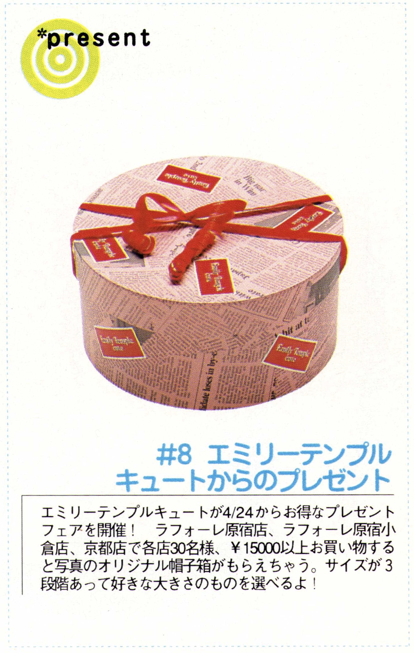 Translated description: "#8 Present from Emily Temple Cute. Emily Temple Cute will be holding a special gift fair from April 24th! 30 customers at each store will receive the original hat box shown in the photo if they spend over ¥15,000 at Laforet Harajuku, Laforet Harajuku Kokura, and Kyoto. There are three sizes, so you can choose the one you like!".